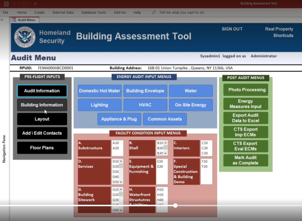 The Building Assessment Tool (BAT) is a publicly available MS Access Application that provides users a structured format for the collection and reporting of energy audit and facility condition assessment information. Designed with Public and Private Sector clients in mind, the system was developed for the Department of Homeland Security, which has made the system broadly available. This 7 minute demonstration video provides agencies and other users important information on the features of the BAT.